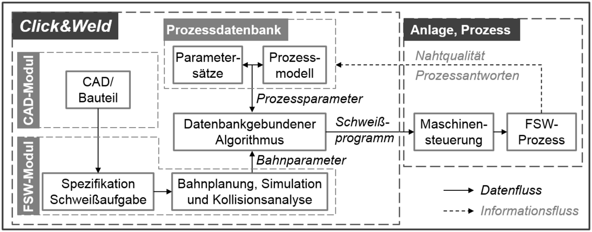 Im Rahmen des AiF-geförderten Forschungsprojekts „Click&Weld“ wird ein computergestütztes, wissensbasiertes Bedienkonzept für das Rührreibschweißen entwickelt, das vergleichbar mit CAM-Systemen ist, wie sie z.B. in der spanenden Fertigung bereits Stand der Technik sind.