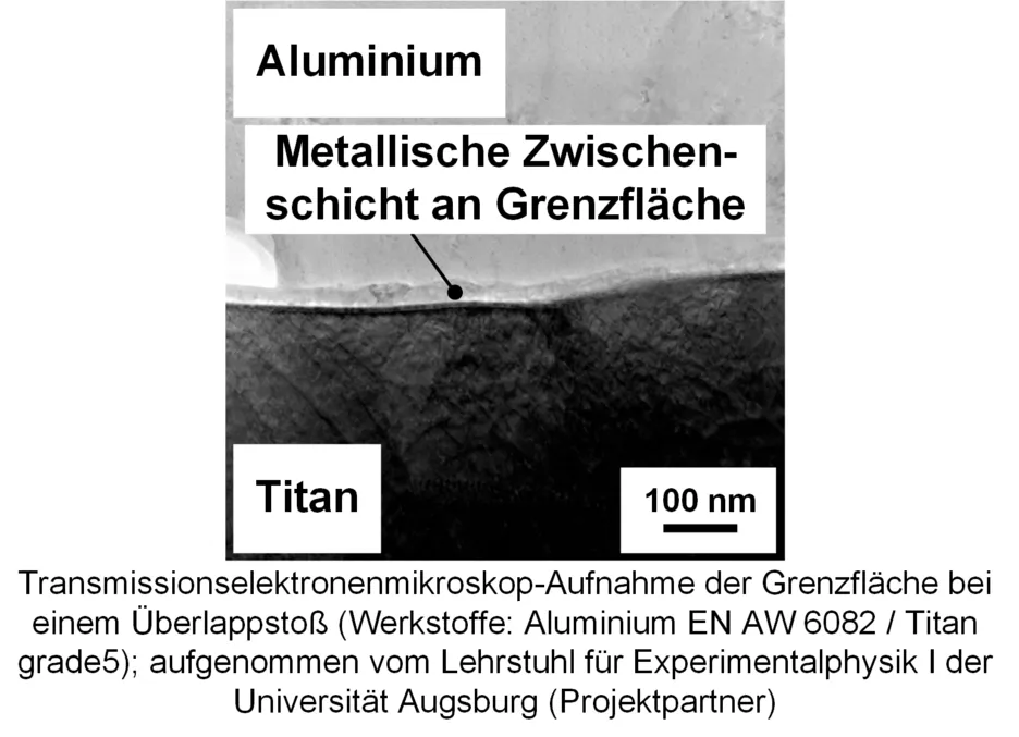 Eine zentrale Erkenntnis der ersten Projektphase war, dass sich eine metallische Zwischenschicht im Nanometerbereich an der Grenzfläche zwischen den Fügepartnern bei Aluminium-Titan-Mischverbindungen bildet. Diese konnte mittels Transmissionselektronenmikroskopie (TEM) nachgewiesen werden. Dies deutete auf eine dominant stoffschlüssige Verbindung hin.