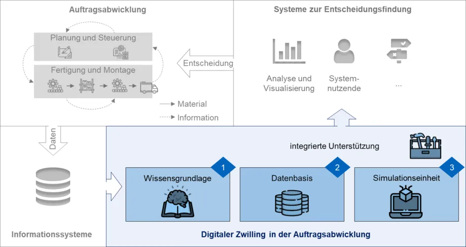 Um diese Herausforderungen zu adressieren, soll die Auftragsabwicklung durch einen digitalen Zwilling abgebildet werden. Dieser erlaubt es Unternehmen, Transparenz über ihre Prozesse, Systeme und Daten zu erlangen. Darüber hinaus sollen mithilfe der Erstellung einer homogenen Datenbasis und der Entwicklung eines prognosefähigen Simulationsmodells Auswirkungen von Entscheidungen aufgezeigt werden. Zu diesen Entscheidungen gehört beispielsweise die Festlegung von Sicherheitsbeständen sowie von maximalen Lagerbeständen. Produktionsprogramme jeder Linie, Auftragsreihenfolgen und Auftragsterminierungen können ebenfalls mithilfe des DZA ermittelt werden.