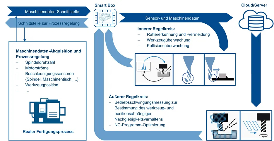 Ein Edge-Computer greift über eine Netzwerkkommunikation auf die Maschinensteuerung zu und führt einen zweistufigen Regelkreis aus. Der innere Regelkreis führt die zeitkritischen Aufgaben der Rattererkennung und -vermeidung, der Kollisionsüberwachung und der Werkzeugverschleißdetektion aus. In der äußeren Regelschleife wird auf Grundlage des positions- und werkzeugabhängigen Nachgiebigkeitsverhaltens eine Optimierung der Bauteilprogramme durchgeführt. Dadurch soll sichergestellt werden, dass keine dynamischen Instabilitäten, nur geringe Konturfehler und kleine Bearbeitungskräfte während der Zerspanung auftreten. Aufgrund dessen bietet der Regelkreis neben einer gesteigerten Fertigungsgenauigkeit auch eine höhere Werkzeug- und Maschinenstandzeit. Die entscheidende Herausforderung dieses Forschungsvorhabens ist die Frage, wie eine möglichst hochfrequente Maschinendatenakquisition ohne umfangreiche Zusatz-Sensorik realisiert werden kann. Außerdem gilt es, die prozess-parallele Überwachung und Regelung des Bearbeitungsprozesses durch eine effiziente Identifikation und mathematische Beschreibung der Anlagendynamik zu ermöglichen.