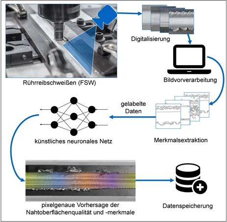 Ein automatisiertes optisches System, das auf Basis von Bilddaten und Methoden des maschinellen Lernens die Qualitätssicherung erfüllt, stellt eine neue Prüfmethode für das Rührreibschweißen dar. Damit besteht das Potential zur Substitution der subjektiven menschlichen Sichtprüfung durch ein System, das eine personenunabhängige Bewertung der Schweißnahtqualität erlaubt. Eine Dokumentation der Ausprägung der Nahtoberflächenmerkmale ermöglicht außerdem eine nachgelagerte Analyse von möglichen Störgrößen, die auf den Prozess wirken und eine Veränderung in der Nahtoberfläche erzeugen (z. B. exzessive Gratbildung durch eine gestörte Wärmeabfuhr). Durch die Klassifikation der Nahtmerkmale mit einer Wahrscheinlichkeitsangabe kann die Verwertbarkeit des Ergebnisses quantitativ beurteilt werden.