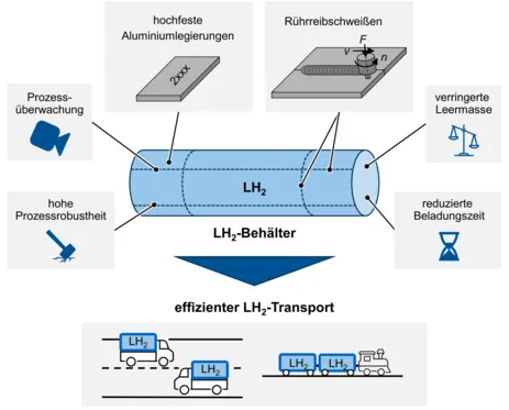 Das Ziel des Projektes ist die Befähigung zur Fertigung von Leichtbau-Behältern für den Transport von Wasserstoff im flüssigen Aggregatszustand (engl.: liquid hydrogen, LH2). Der belastungsgerechte Leichtbau wird durch hochfeste Aluminium-Legierungen sowie durch die hohe Reproduzierbarkeit und Prozessrobustheit des Rührreibschweißens (engl.: friction stir welding, FSW) ermöglicht. Das reduzierte Behältergewicht erlaubt die Mitnahme von neuartigem, schweren Equipment zur schnelleren Beladung mit LH2 und den Transport größerer Mengen an LH2, wodurch die Effizienz der LH2-Distribution gesteigert wird.