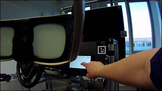 The following video shows a setup from an experiment. The open/close state is transmitted to a tablet. So, the tablet can log for every subtask the total shutter open times. As an indicator that the wifi/network connections are working the tablet dimms the background light shortly when the occlusion glasses close. This is not visible for the test subject, but the experimenter knows that everything is working.
