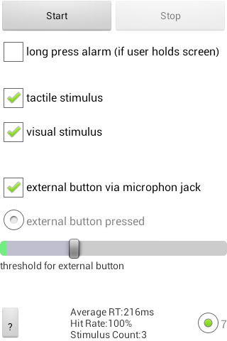 With the external button checkbox the use of an external button can be enabled. It is an tempting idea to simply use the headset buttons which are normally used for speech recognition and music player controll, as a response button. Unfortunally a test with these gave unsatisfying result: An Arduino was programmed to get the onset of the vibration motor directly from the phone’s printed circuit board and issue a defined headset button press after a fixed amount of time. In the results these fixed times were affected by different nuisances. The related code is still in the source code, but commented out. If you want to fiddle about, don’t hesitate.