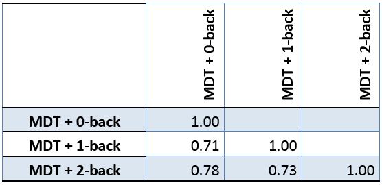 Twenty participants were tested in a between-subjects design experiment. Participants performed a baseline (operating only the MDT) the n-back in 3 levels (MDT+0-back, MDT+1-back, MDT+2-back). As well as a combination with a Continuous Tracking Task (CTT with joystick): MDT+ CTT, MDT+CTT+0-back, MDT+CTT+1-back, MDT+CTT+2-back. Half of the participants performed the n-back tasks as system-paced and the other half as user-paced. Two tailed t-tests for the relevant conditions showed no significant difference between the user-paced and system-paced means. Therefore, as we deal with the differences between the MDT and DRT measurements, the measures of both n-back groups are combined for this comparison.