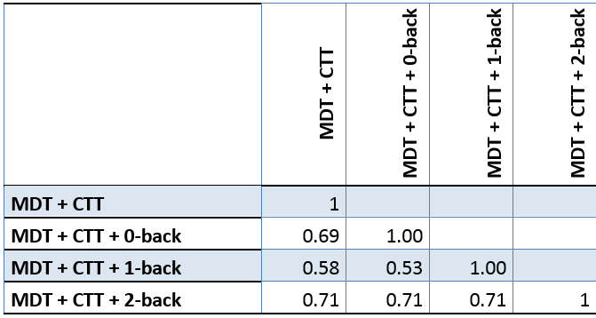 In Krause et al. (2014) we used the correlation between experimental conditions as a quality measure for the hardware and experimental setup. For Krause et al. (2014) the MDT was mounted to the steering wheel and the subject responded via the touchscreen. The correlations for this setup were between 0.2-0.3 and therefore the setup was denoted a low quality setup. The following tables show that mounting the MDT on the arm reveals correlation of about 0.5-0.8. This is comparable to correlations we found with a DRT setup in real traffic (Krause et al., 2015).