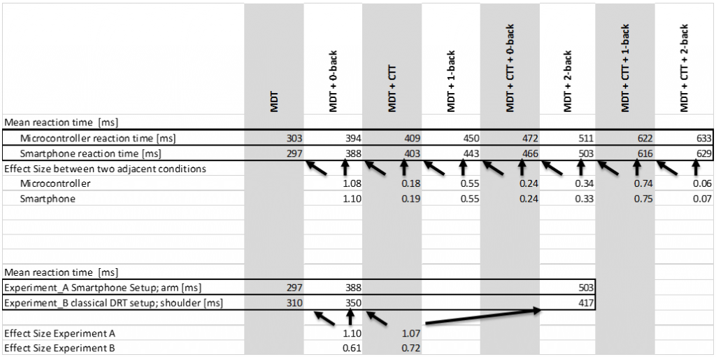 In the table the experimental conditions are ranked by increasing mean reaction time (ms) and the effect size (Cohens d) between adjacent experimental conditions is calculated, based on the microcontroller values and based on the smartphone values. The difference in effect size between the values measured with smartphone and microcontroller is negligible. Thus, one minute MDT (~15 stimuli; 20 subjects) is more than enough, to compensate the lack of real-time capability of the smartphone. The conditions baseline (MDT), MDT+0-back and MDT+2-back from this experiment (Experiment A; N=20) are also compared to the outcome of another experiment (Experiment B; N=35) with classical DRT equipment and vibrating motor on the shoulder. In this comparison the MDT would even provide a higher effect size.