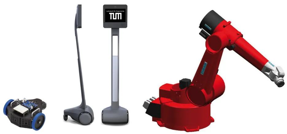 Der Lehrstuhl für Ergonomie verfügt über drei Robotersysteme unterschiedlicher Einsatz- und Untersuchungsgebiete. Dabei erstreckt sich das Portfolio von ortsfestem Industrieroboter bis hin zu hochdynamisch mobilen Robotersystemen.