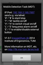 The Mobile Detection Task (MDT) is a derivative of the Detection Response Tasks (see e.g. https://www.mw.tum.de/en/lfe/arduino-drt) allowing mobile, wireless experimentation through the use of a nomadic device (Android smart phone). Since the MDT is not within the DRT ISO Standard (currently under development), this task is referred to a MDT rather than a DRT, despite similar task qualities. The DRT is being standardized under ISO (ISO/CD 17488) and is used to measure the attentive effects of cognitive workload induced by the performance of a task or tasks of interest (see Conti, Dlugosch, & Bengler, 2014).