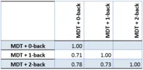 In Krause et al. (2014) we used the correlation between experimental conditions as a quality measure for the hardware and experimental setup. For Krause et al. (2014) the MDT was mounted to the steering wheel and the subject responded via the touchscreen. The correlations for this setup were between 0.2-0.3 and therefore the setup was denoted a low quality setup. The following tables show that mounting the MDT on the arm reveals correlation of about 0.5-0.8. This is comparable to correlations we found with a DRT setup in real traffic (Krause et al., 2015).