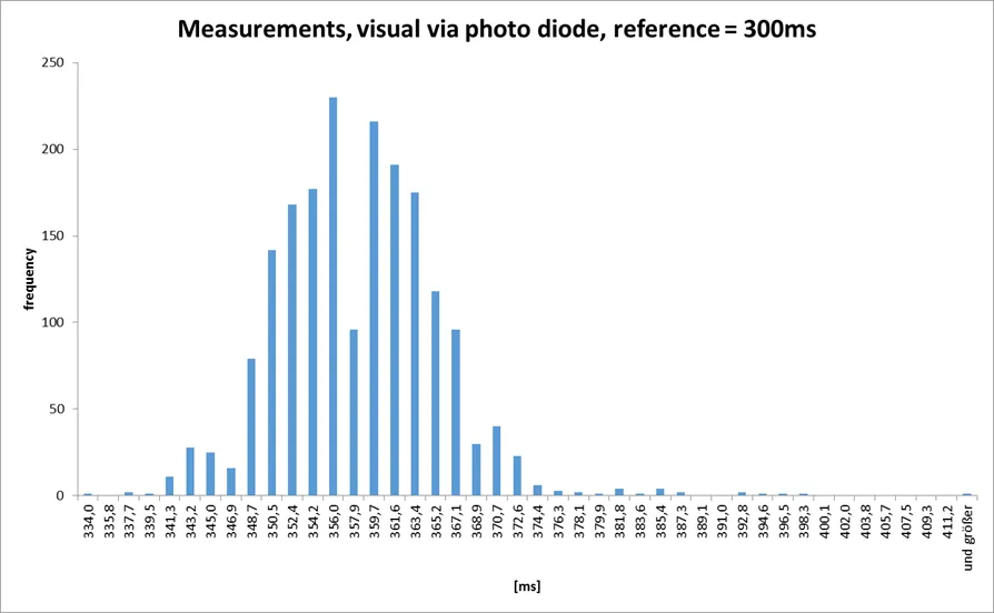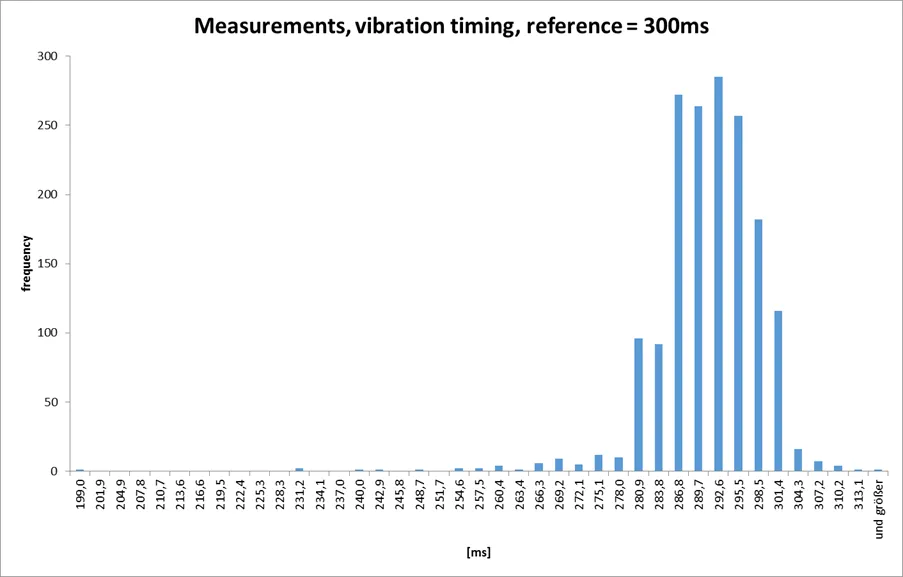 To get a clue about what times we are talking about, a test circuit was set up: An Arduino Uno read in the onset voltage of the vibration stimulus (direct from the phone circuit board) or the visual stimulus via an photo diode on the display and issued an external button press via the phone jack after a defined delays of time (300ms). So the measured times and the deviation from 300 ms is what we are interested in. The smart phone was a Samsung S5830 Android 2.3.6. The first histogram shows the measurement of N=1651 reference reaction time (300ms). The mean is 289.5ms (SD= 7.9ms; MIN=199ms MAX=316ms). During the measurements the visual stimulus was also enabled. Time taking in code starts after preparing both tactile and visual stimuli (depending on enabled or not). The second histogram shows the same measurement for N=1895 visual stimuli (M= 357.4ms; SD=7.2ms; MIN=334; MAX=413ms).