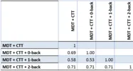 Twenty participants were tested in a between-subjects design experiment. Participants performed a baseline (operating only the MDT) the n-back in 3 levels (MDT+0-back, MDT+1-back, MDT+2-back). As well as a combination with a Continuous Tracking Task (CTT with joystick): MDT+ CTT, MDT+CTT+0-back, MDT+CTT+1-back, MDT+CTT+2-back. Half of the participants performed the n-back tasks as system-paced and the other half as user-paced. Two tailed t-tests for the relevant conditions showed no significant difference between the user-paced and system-paced means. Therefore, as we deal with the differences between the MDT and DRT measurements, the measures of both n-back groups are combined for this comparison.