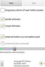 With the external button checkbox the use of an external button can be enabled. It is an tempting idea to simply use the headset buttons which are normally used for speech recognition and music player controll, as a response button. Unfortunally a test with these gave unsatisfying result: An Arduino was programmed to get the onset of the vibration motor directly from the phone’s printed circuit board and issue a defined headset button press after a fixed amount of time. In the results these fixed times were affected by different nuisances. The related code is still in the source code, but commented out. If you want to fiddle about, don’t hesitate.