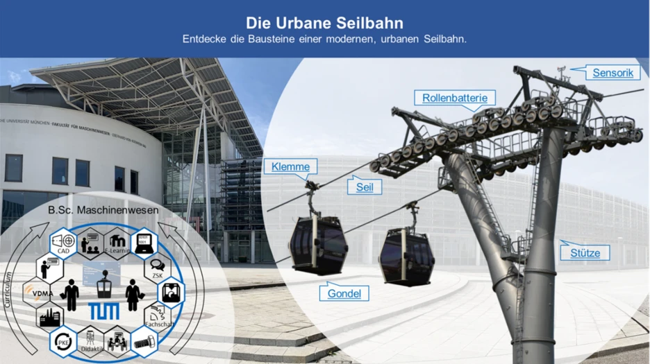 Im Bachelorstudiengang Maschinenwesen der TUM School of Engineering and Design steht eine zukunftsorientierte Lehre mit vertieften Praxisbezügen im Mittelpunkt. Mit dem innovativen Lehrkonzept connecTUM wurde dazu ein Projekt ins Leben gerufen, das zentrale Inhalte des Grundstudiums anhand einer realen technischen Anwendung – einer urbanen Seilbahnanlage – erlebbar macht. Studierende vertiefen ihr Wissen durch praxisnahe Demonstratoren, Exkursionen zu Industriepartnern und kontextbezogene Gastvorträge in den Vorlesungen. Dabei arbeiten mehrere Professuren und Lehrstühle zusammen, um eine vernetzte und anwendungsangenäherte Ausbildung zu ermöglichen.