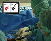 Stand der Technik | Gegenwärtig tastet der Chirurg nach den Tumorgebieten und verwendet einen Ultraschallkopf, um die Metastasen und Gefäße in der Leber erkennen zu können. Das Ultraschallbild ist eine Orientierungshilfe bevor die chirurgischen Instrumente eingesetzt werden. |