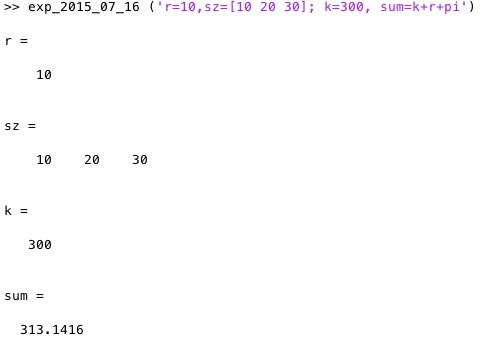 | % exp_2015_07_16 (varstr) - EXAMPLE for a very elegant method to transfer % variable definitions % (by Tim Lueth, VLFL-Lib, 2015-JUL-16 as class: AUXILIARY PROCEDURES) % % This is not a fast but very elegant method to declare variables by a % parameterstrinf directly in Matlab Syntax (Status of: 2015-07-16) % % exp_2015_07_16(varstr) % === INPUT PARAMETERS === % varstr: parameter variable string, for example (varargin{1}) % % EXAMPLE: exp_2015_07_16 ('r=10,sz=[10 20 30]; k=300, sum=k+r+pi') % |