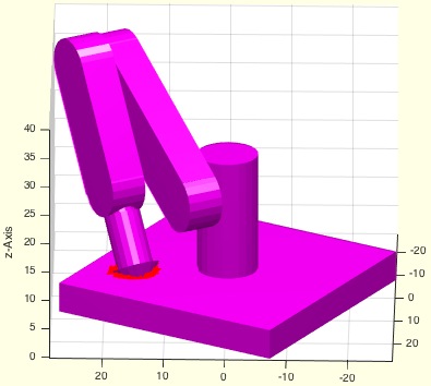 | % KMofSGs(SGs,dphi,thr) - returns a Kinematic model for a chain of solids % (by Tim Lueth, VLFL-Lib, 2015-AUG-09 as class: KINEMATICS AND FRAMES) % % The solids are given as cell list: {SG1,SG2,SG3...} % The procedure also performs a collision test to give a feedback on the % geometry. For this purpose all facets of the analyzed links are % shrinked by thr=0.1. and compared with all surfaces of the links in the % chain before. % % % At a later stage, it is absolutely necessary to integrate the chains % into the model % KM.m=models (i.e. current KM) % KM.c=chains % (Status of: 2015-08-09) % % [KM,chain]=KMofSGs(SGs,[dphi,thr]) % === INPUT PARAMETERS === % SGs: Cell list of solids: {SG1,SG2,SG3...} % dphi: angle degree (default is 105 degree) for all joints % thr: threshold for collision test; default is 0.1 (==2*0.05) % === OUTPUT RESULTS ====== % KM: Kinematic Model including a simple chain % chain: generated chain of frames % % EXAMPLE: Create a strange robot % KMofSGs ({SG0,SG1,SG2,SG2,SG2,SG3,SG2,SG4}); % |
