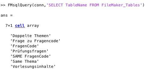 FMsqlQuery(conn,sqlreq)- returns the answer to a SQL request to a FileMaker database |