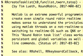 | % RRrun.RRcreateTasklist(t0,funclist,twarn,tstop) - creates a Round Robin task list % (by Tim Lueth, RoundRobin, 2017-MÄR-02) % % Matlab is an extreme powerful programming environment that allows to % create even simple round robin realtime systems for every body. It % makes sense to understand the principles of a round robin system before % using matlab threads on a not-realtime-operationg system and before % switching to realtime-OS such as QNX or Kithara. % This "Round Robin task list" class works with real fnctns handles and % persistent and global variables as well as with simple matlab command % line commands. (Status of: 2017-03-05) % % See also: RRshell, RRkeyboardCallback, RRhelp % % RRL=RRcreateTasklist([t0,funclist,twarn,tstop]) % === INPUT PARAMETERS === % t0: Clock cycle time % funclist: cell list of fnctn handles % twarn: optional warning time; default is INF % tstop: optional stop time; default is INF % === OUTPUT RESULTS ====== % RRL: Round Robin List struct % % EXAMPLE: % RRcreateTasklist(1,{' PL=[0 0 0]; PLplot(PL); show;';... % 'PL=[PL;PL(end,:)+rand(1,2)'}) % |