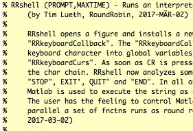 | % RRrun.RRshell (PROMPT,MAXTIME) - Runs an interpreter shell for a limited period of time to simulate a realtime system % (by Tim Lueth, RoundRobin, 2017-MÄR-02) % % RRshell opens a figure and installs a new keyboard callback fnctn % "RRkeyboardCallback". The "RRkeyboardCallback" fnctn writes pressed % keyboard character into global variables "RRkeyboardLine" and % "RRkeyboardCurs". As soon as CR is pressed, "RRkeyboardLine" contains % the char chain. RRshell now analyzes some master keyowrds such as % "STOP", EXIT', QUIT" and "END". In all other cases the "eval" fnctn of % Matlab is used to execute the string as command line. % The user has the feeling to control Matlab directly but in fact in % parallel a set of fnctns runs as round robin task list (Status of: % 2017-03-05) % % See also: RRkeyboardCallback, RRhelp, RRcreateTasklist % % RRshell([PROMPT,MAXTIME]) % === INPUT PARAMETERS === % PROMPT: Desired entry prompt; default is "RRshell" % MAXTIME: Maximum time before exit the shell; default is 60 seconds % |