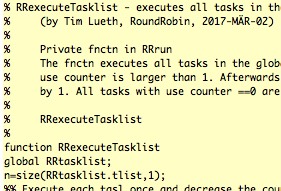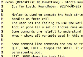 | % RRrun.RRexecuteTasklist - executes all tasks in the global RRtasklist one time % (by Tim Lueth, RoundRobin, 2017-MÄR-02) % % Private fnctn in RRrun % The fnctn executes all tasks in the global RRtasklist one time if the % use counter is larger than 1. Afterwards the use counter is decreased % by 1. All tasks with use counter ==0 are deleted (Status of: 2017-03-07) % % RRexecuteTasklist % |