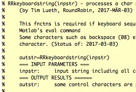 | % RRrun.RRkeyboardstring(inpstr) - processes a char array similar to an input scan process % (by Tim Lueth, RoundRobin, 2017-MÄR-03) % % This fnctns is required if keyboard sequences should be send to % Matlab's eval command % Some characters such as backspace (08) eliminate the preceding % character. (Status of: 2017-03-07) % % outstr=RRkeyboardstring(inpstr) % === INPUT PARAMETERS === % inpstr: input string including all control characters % === OUTPUT RESULTS ====== % outstr: some control characters are processed % |