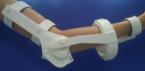Das Aufbringen von hohen Lasten auf den Unterarm oder die Handfläche fördert eine Überstreckung (Hyperextension) des Ellenbogengelenkes und kann zu Verletzungen führen. Daher wurde im Rahmen dieser Masterarbeit eine Ellenbogenorthese entwickelt, die beim Heben von schweren Lasten die Extension des Gelenkes begrenzt und präventiv im Arbeitsalltag (z.B. in der Altenpflege) eingesetzt werden kann. Der Gelenkwinkel wird dabei erst bei Lastaufnahme begrenzt, sodass im unbelasteten Fall die Bewegung des Ellenbogens uneingeschränkt möglich ist.