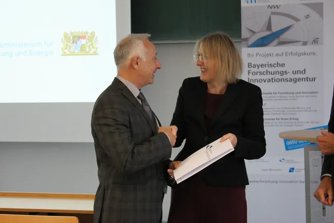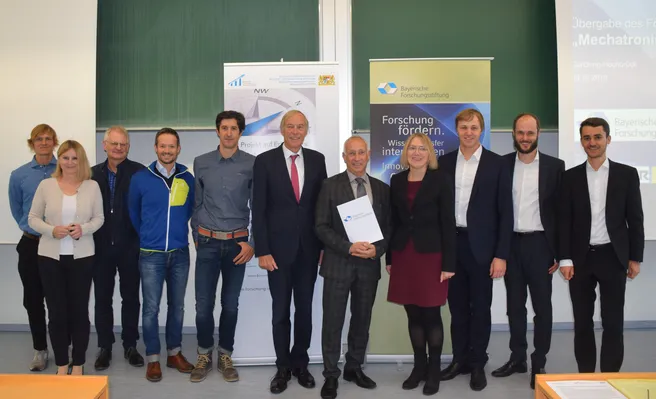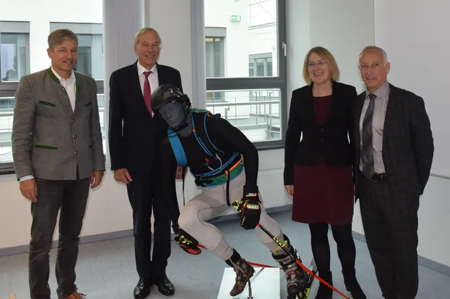 Mit der Übergabe des Förderbescheids durch die Ministerialdirektorin Dr. Sabine Jarothe startet das Projekt "Mechatronische Skibindung". Das 3-Jährige Vorhaben, an dem neben der Professur für Sportgeräte und -materialien die Firmen "Marker", "Völkl", "Schöffel", "Moticon", "InteractiveWear" und "2D Debus&Diebold" beteiligt sind, hat ein Volumen von 922.000 €.