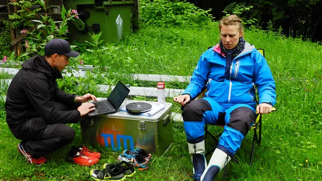Im Modul „Methoden des Sports Engineering“ fand auch im SS2017 das „Sporttechnologische Projekt“ in Garmisch-Partenkirchen statt. Eine Gruppe beschäftigte sich dabei mit den Traktionseigenschaften von Trail-Running-Schuhen –das eher regnerische Wetter lieferte dazu die idealen Randbedingungen. Bei der anderen Gruppe ging es um die Validierung eines von SpGM entwickelten Sensornetzes, welches sich zwischen Helm und Kopf befindet und die Temperaturverteilung misst. Dazu mussten die Probanden in Maximaltempo die Höhenmeter vom Stadion bis hoch zum Schanzentisch absolvieren. Ziel der Lehrveranstaltung ist es, praktische Erfahrungen im Umgang mit spezieller Messtechnik zu machen und dabei die typischen Herausforderungen von Feldstudien zu meistern. Die Ergebnisse der beiden Studien werden zu Beginn des Wintersemesters im Rahmen einer Präsentation vorgestellt.