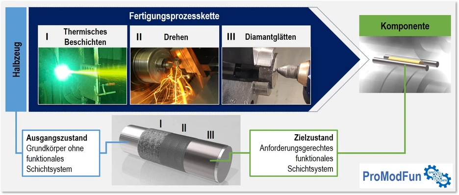 Mittels eines experimentellen Vorgehens und datenbasierter Modellbildung soll die Prozesskettenoptimierung in ProModFun vorgenommen werden. Zunächst erfolgt der Aufbau der Prozesskette aus (1) Thermischem Beschichten, (2) Drehen und (3) Diamantglätten zur Herstellung einer Funktionsoberfläche mit oberflächennaher, gradierter Härtesteigerung. Das innovative Eigenschaftsprofil soll am Beispiel der Komponente „Führungsrolle“ ausgeführt werden. Durch thermisches Beschichten (primäre Formgebung) werden auf rotationssymmetrischen Komponenten Oberflächen aus Manganhartstahl aufgebracht und durch Drehen und Diamantglätten hinsichtlich Kern- und Randeigenschaften angepasst. Die zu optimierenden Zielgrößen der Prozesskette sollen wie folgt beeinflusst werden: (1) Oberflächenhärte maximieren, (2) Oberflächenrauheit minimieren, (3) Oxidgehalt des Schichtsystems maximieren und (4) die Energieeffizienz der Oberflächenerzeugung maximieren.